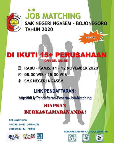 Job Matching akan digelar di SMK Negeri Ngasem Pada minggu depan. Tepatnya, pada Hari Rabu-Kamis, 11-12 November 2020 yang akan diikuti oleh 15 lebih perusahaan. Job Matching adalah kegiatan yang dilakukan untuk meningkatkan pemahaman dunia usaha dan industri terhadap kemampuan/kompotensi yang dimiliki pencari kerja sesuai dengan lowongan pekerjaan atau posisi jabatan yang tersedia di dunia industri atau dunia usaha.